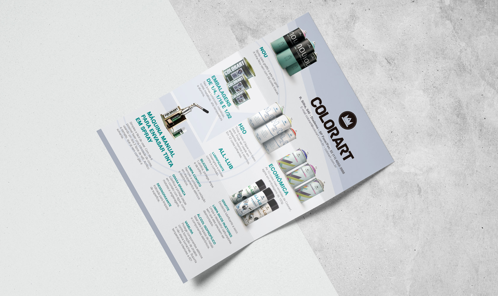 A ColorArt é uma empresa de tintas em spray que atua no mercado brasileiro. Em 2015, a marca decidiu realizar um rebranding em toda sua identidade. Refizemos embalagens e catálogos e criamos uma nova linha de sprays (NOU) para atender a demanda artistas de rua.