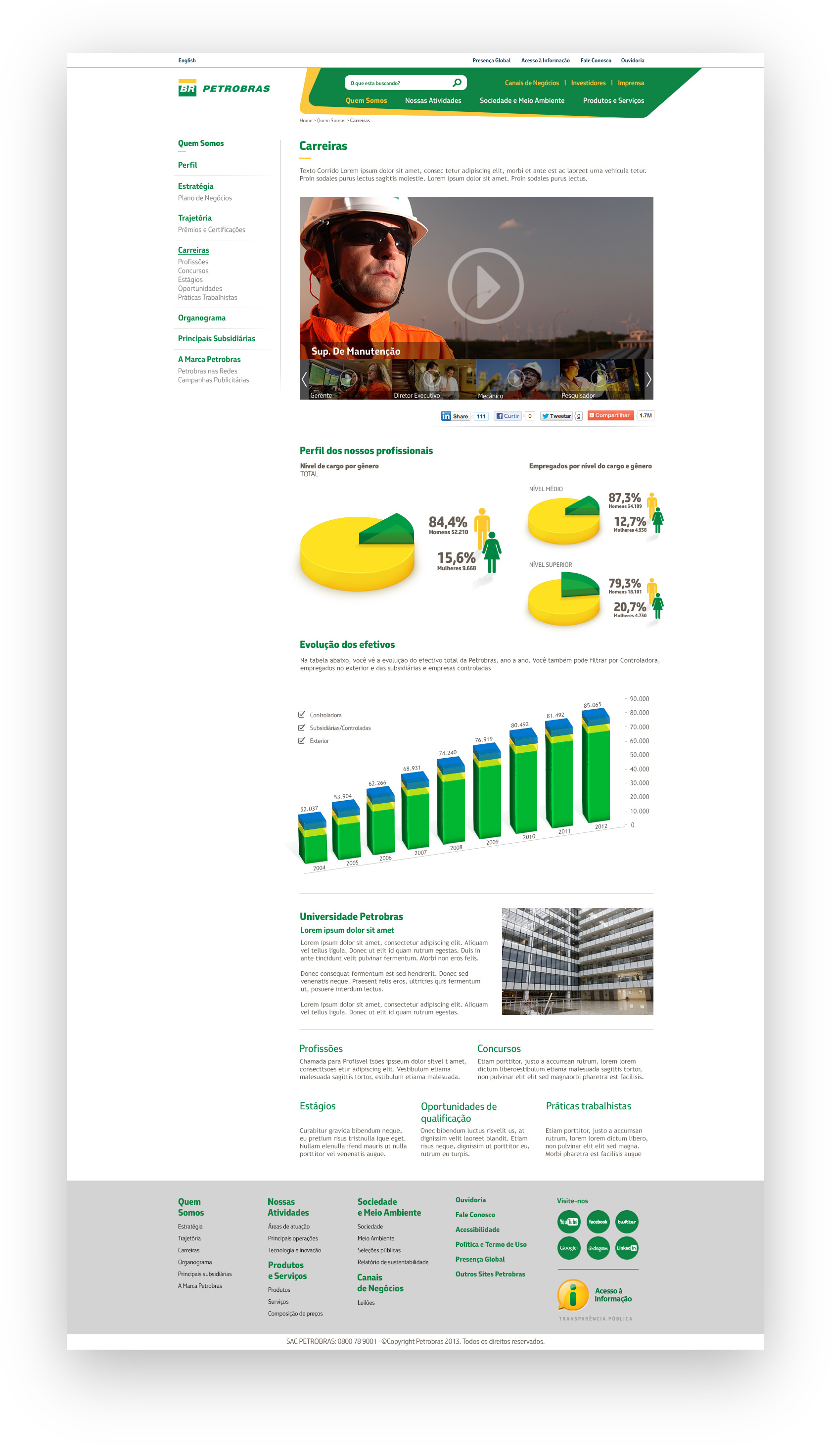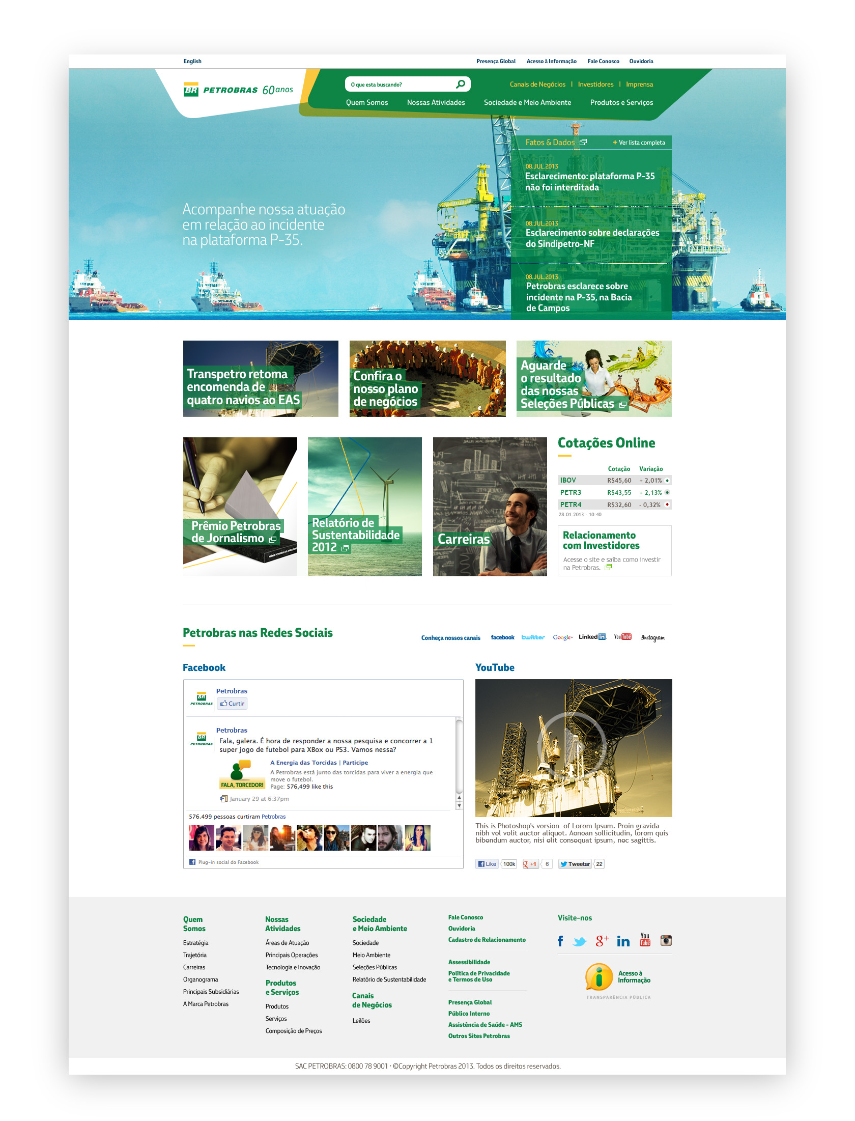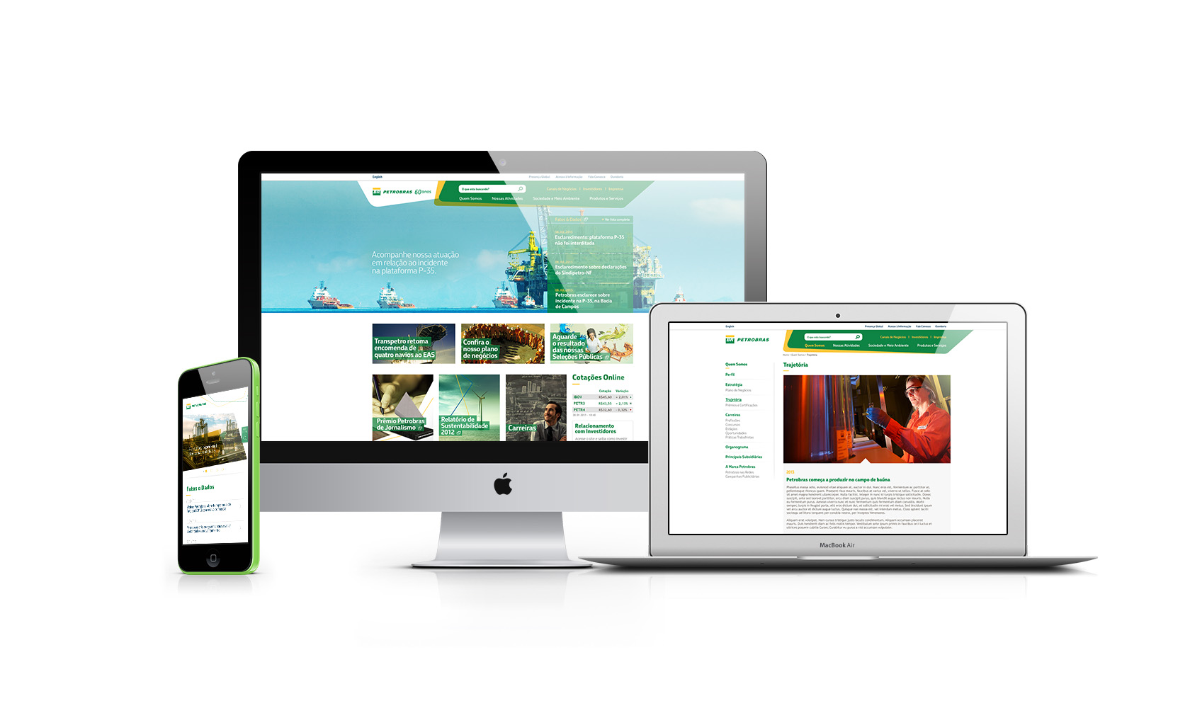 A Petrobras é uma das maiores empresas do mundo e tivemos a oportunidade de desenvolver seu portal, lançado no início de 2014. Este novo site foi totalmente construído de forma responsiva, mantendo a mesma experiência, independentemente da plataforma que o usuário estiver.