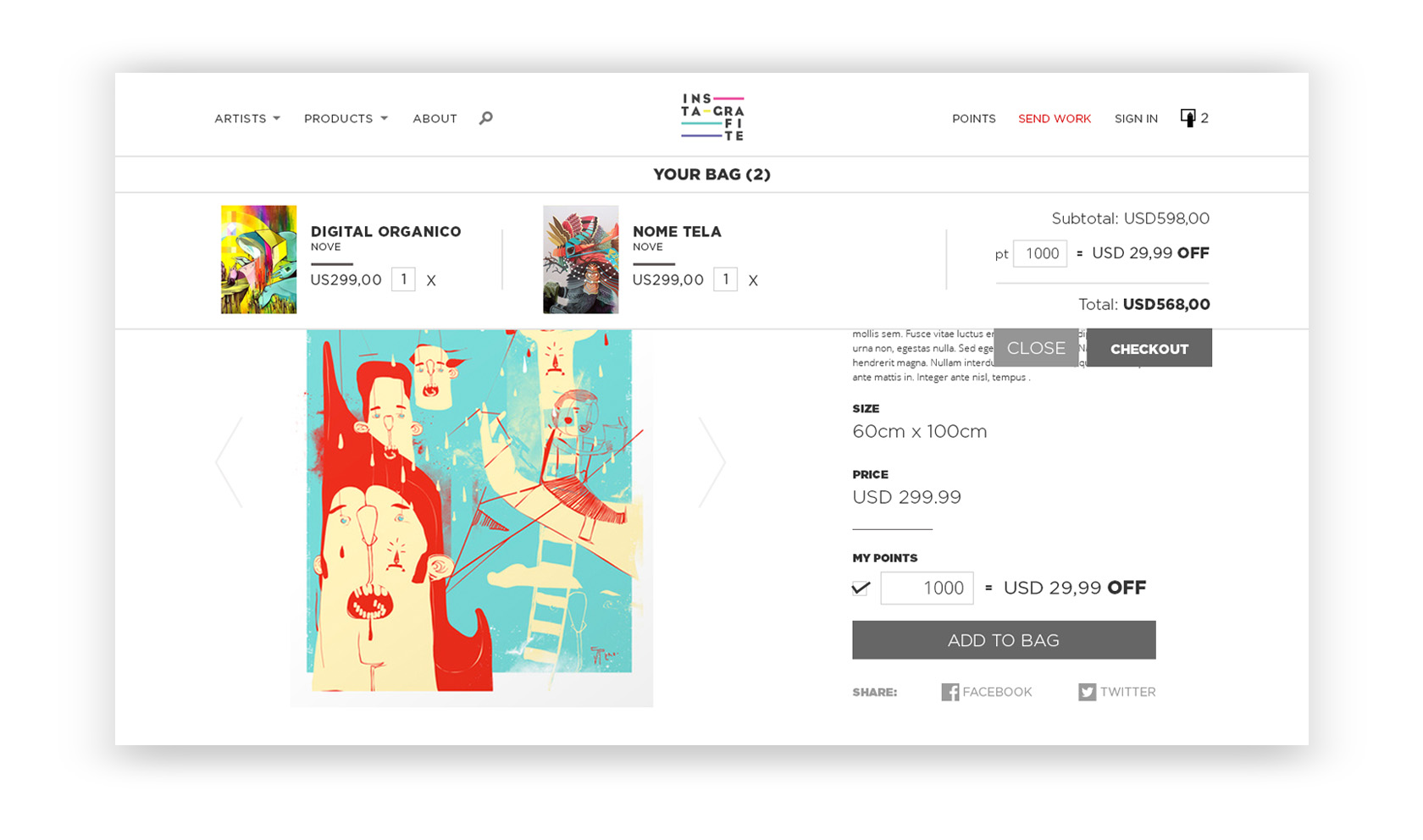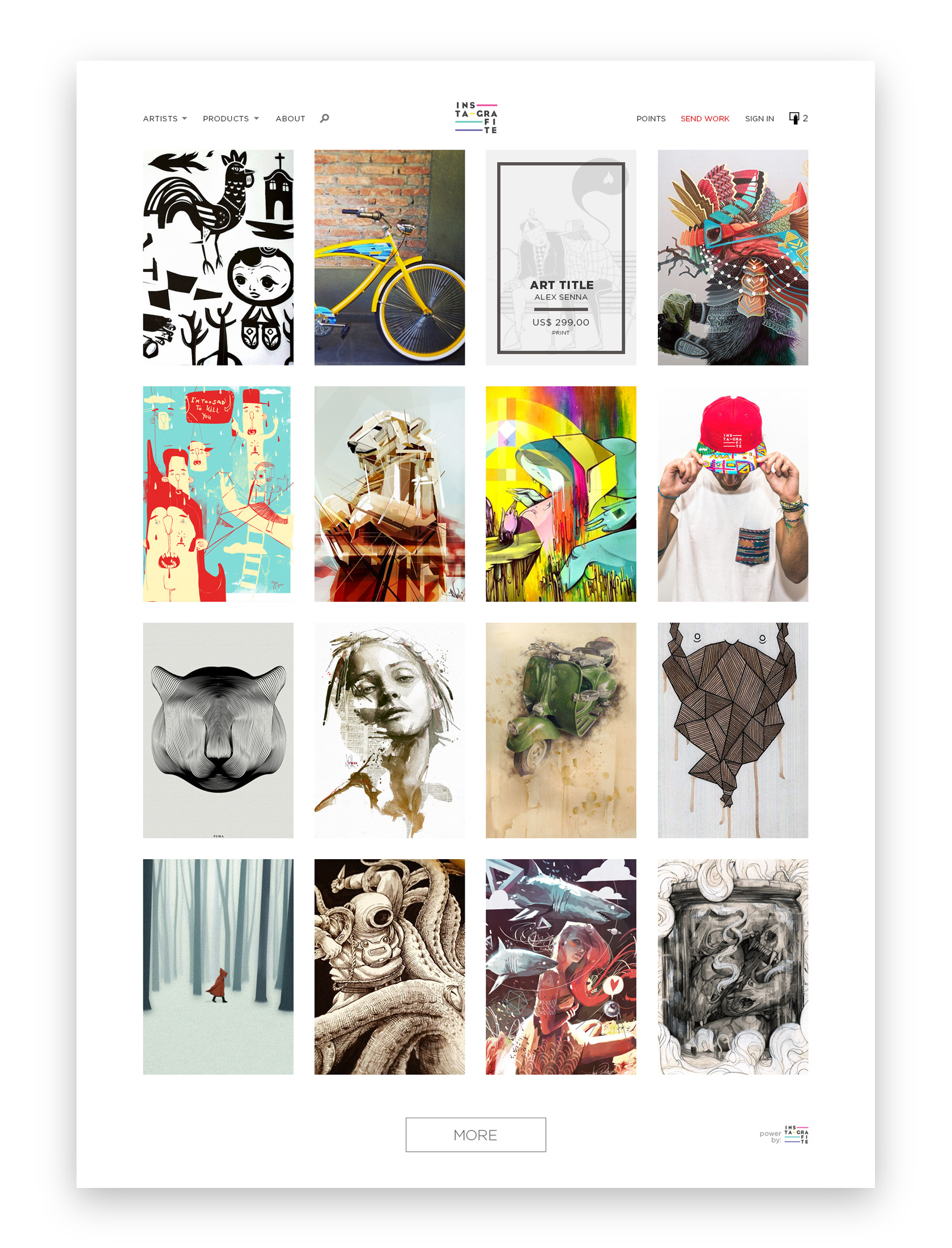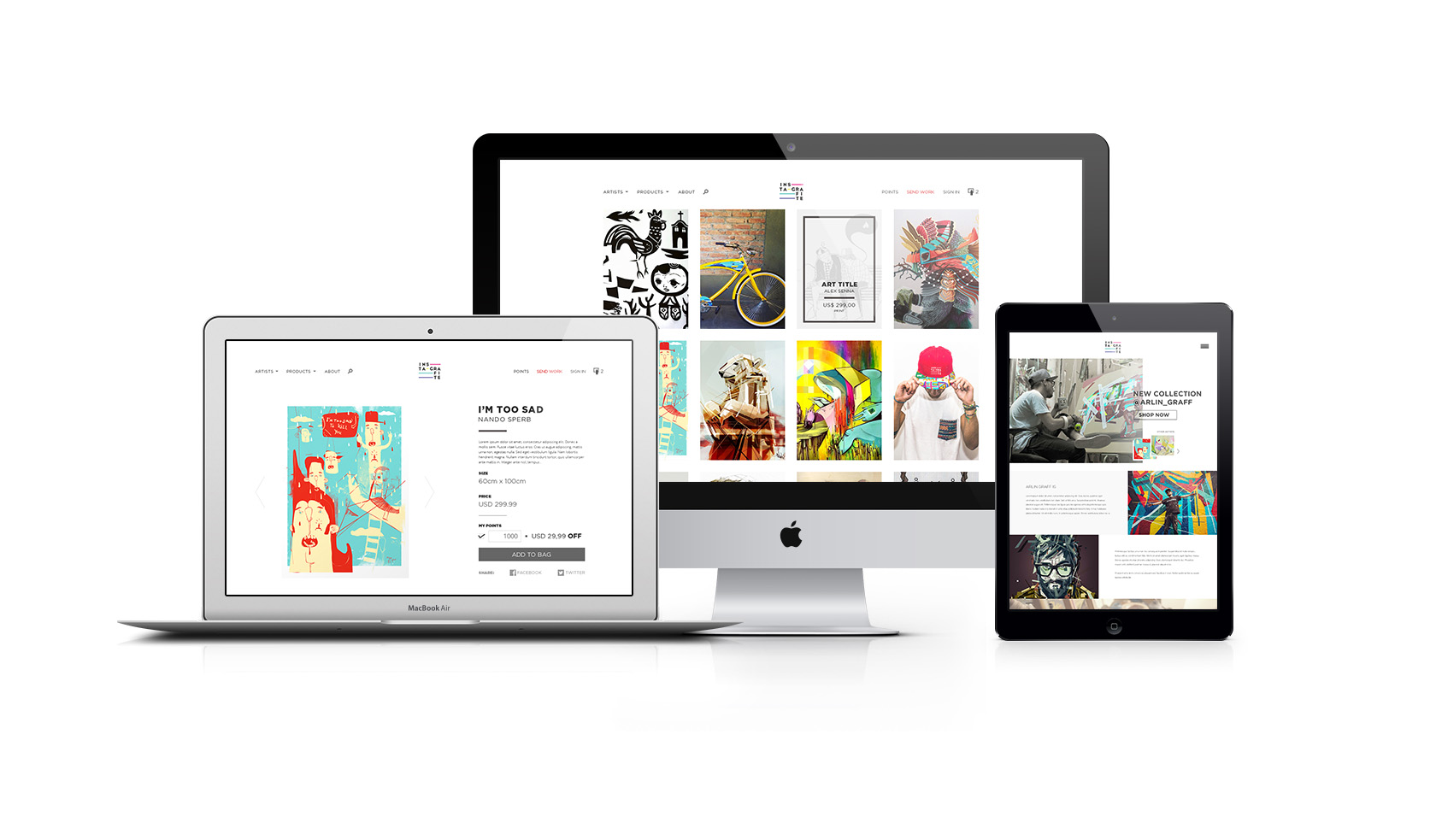 Em 2016 fui convidado a criar o seu primeiro e-commerce. Um dos pontos mais importantes para esse projeto era valorizar as obras e a página pessoal de cada artista em todos os aspectos, além de manter a mesma experiência em dispositivos móveis.